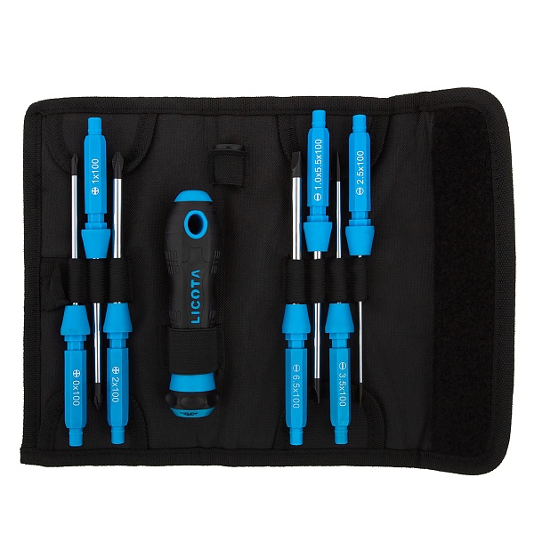 Отвертка со сменными вставками Licota ASD-CHS101K, набор из 8 предметов. В комплект входят 4 жала с профилем SL (шлиц), 3 жала с профилем PH (крест) и двухкомпонентная рукоятка-держатель. Длина сменных жал - 100 мм.