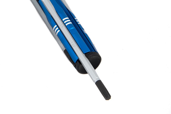Корпус отвертки одновременно служит футляром-держателем для сменных жал, предохраняя их от потери или поломки.