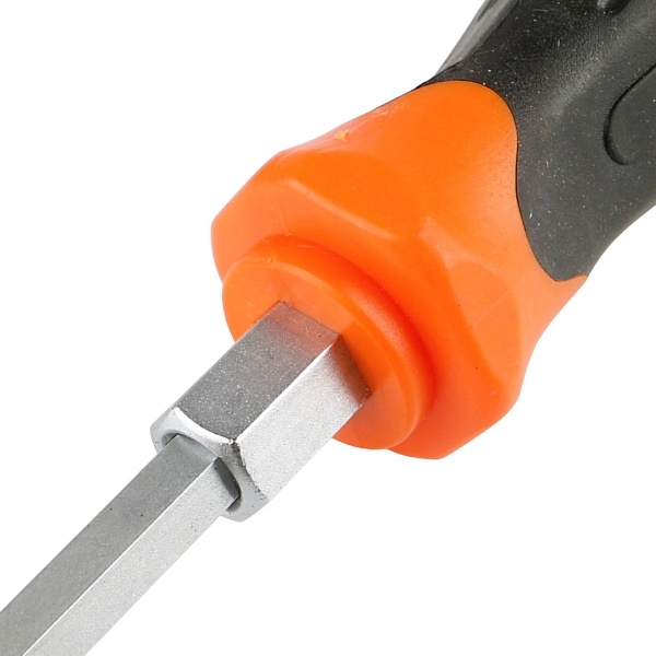 Стержень отвертки проходит через всю рукоятку и заканчивается ударным затыльником. При откручивании “закисшего” или “прикипевшего” крепежа это позволяет дополнительно прикладывать небольшие ударные нагрузки. Шестигранник между стержнем и рукояткой дает возможность использовать гаечный ключ для увеличения крутящего момента.