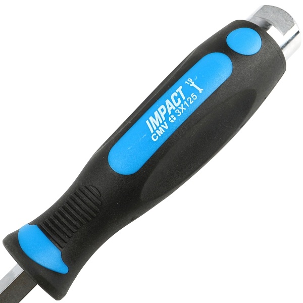Стержень отвертки проходит через всю рукоятку и заканчивается ударным затыльником. При откручивании “закисшего” или “прикипевшего” крепежа это позволяет дополнительно прикладывать небольшие ударные нагрузки. Затыльник имеет два шлица, что дает возможность использовать гаечный ключ для увеличения крутящего момента.