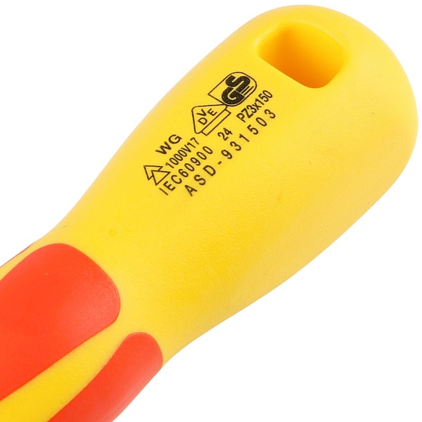 Шток отвертки защищен изолирующим покрытием. Допускается для производства слесарно-монтажных работ в электроустановках до 1000 В. Изоляция диэлектрического инструмента проверена согласно DIN EN 60900 (IEC 60900) в специальной среде (электролит) при напряжении в 10 000 В.