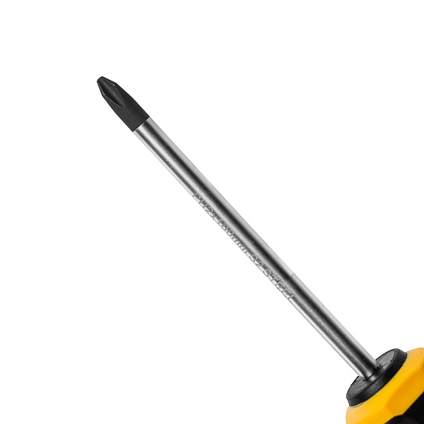 Хромированный стержень из инструментальной стали S2, закаленной до 57-61 HRC, обеспечивает износостойкость инструмента даже при интенсивном использовании. Фосфатирование наконечника повышает сцепление с шлицем крепежа и устойчивость к коррозии. Также наконечник намагничен для дополнительного удержания крепежа.