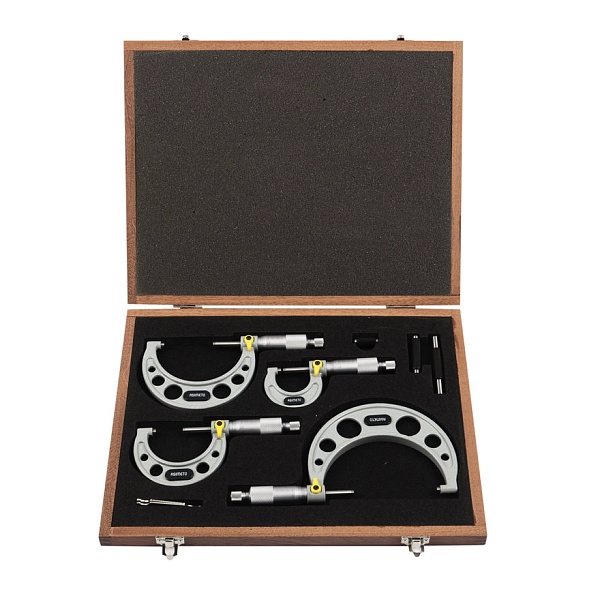 Набор микрометров гладких механических для наружных измерений со скобой Asimeto 101-64-8 - комплект из 4 приборов для измерений линейных размеров абсолютным или относительным контактным методом с низкой погрешностью в области малых размеров. Преобразовательным механизмом является микропара “винт - гайка”.