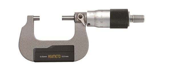 Микрометр гладкий механический для наружных измерений с трещоточным барабаном Asimeto 102-61-0-П - универсальный прибор для измерений линейных размеров абсолютным или относительным контактным методом с низкой погрешностью в области малых размеров. Преобразовательным механизмом является микропара “винт - гайка”.