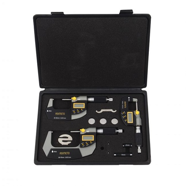 Набор цифровых микрометров 105 серии, 0,001 мм 0-75 мм с поверкой, ASIMETO, 105-63-8-П