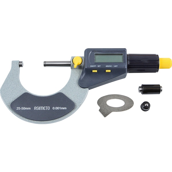 Микрометр гладкий цифровой для наружных измерений Asimeto 116-05-0-П - универсальный прибор для измерений линейных размеров абсолютным или относительным контактным методом с низкой погрешностью в области малых размеров. Преобразовательным механизмом является микропара “винт - гайка”.