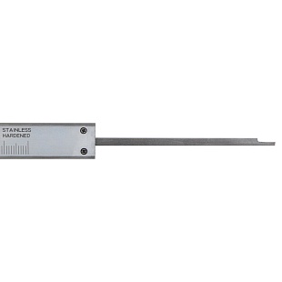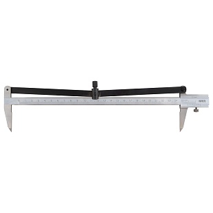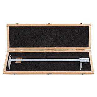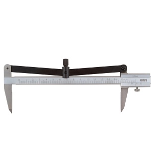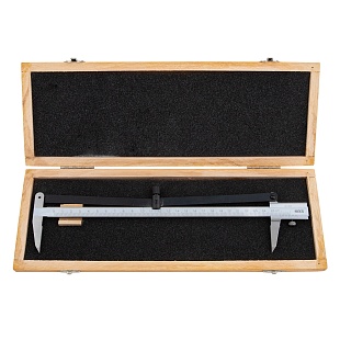 Подвижная рамка с верхним расположением стопора. Измерительные поверхности закалены и отшлифованы. Шкала нониуса с матовым хромированием.