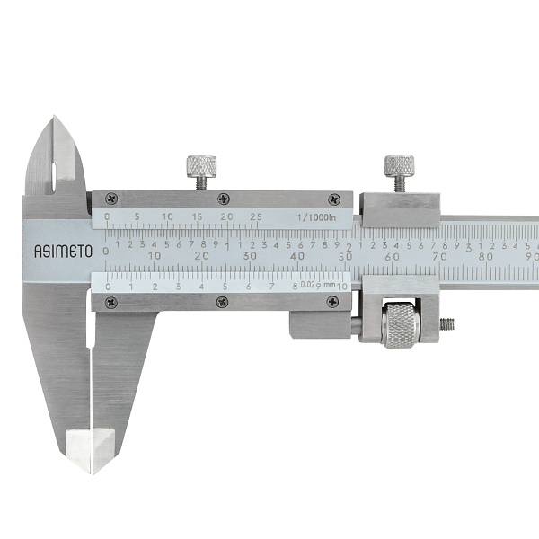 Штангенциркуль нониусный ASIMETO 0363-05-06 серии 363 из нержавеющей стали с губками для внутренних и наружных замеров и плоским глубиномером. Предназначен для измерения линейных размеров малогабаритных деталей.