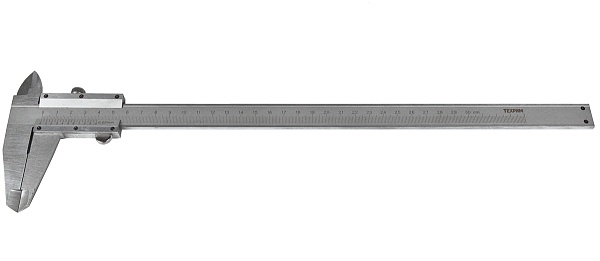Штангенциркуль нониусный ШЦ-I-300 ТЕХРИМ T050018 из углеродистой стали с глубиномером и губками для внутренних и наружных замеров. Предназначен для измерения линейных размеров деталей.