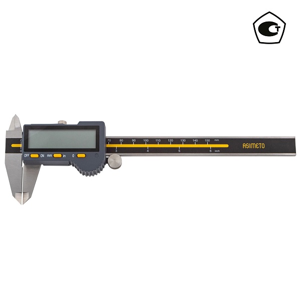 Цифровой штангенциркуль ASIMETO 306-12-5 для измерения наружных и внутренних размеров. При работе с цифровыми штангенциркулями результат измерений отображается на дисплее. Инструмент используют, когда данные необходимо получить быстро, без расчёта дополнительных шкал.