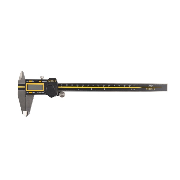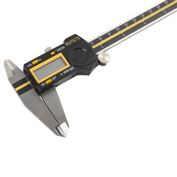 Цифровой штангенциркуль ASIMETO 307-62-3 для измерения наружных и внутренних размеров. При работе с цифровыми штангенциркулями результат измерений отображается на дисплее. Инструмент используют, когда данные необходимо получить быстро, без расчёта дополнительных шкал.