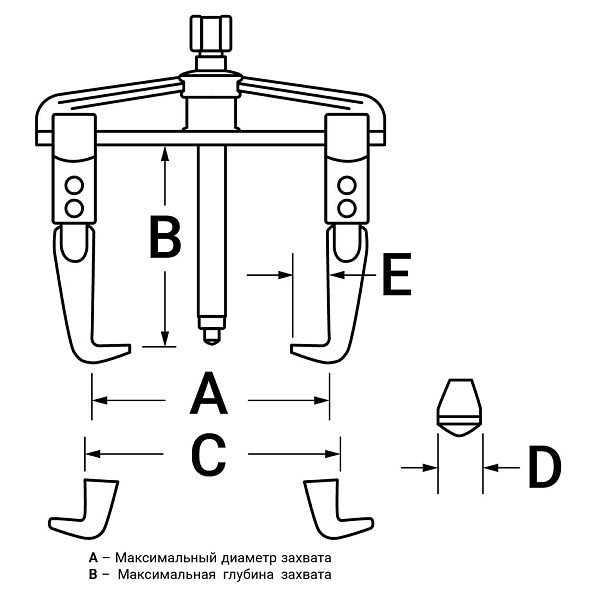 Съемники “американского” типа можно использовать для внешнего и внутреннего захвата детали.Захваты свободно перемещаются по направляющим траверсы, сохраняя одинаковую площадь пятна контакта лап с демонтируемой деталью.При работе захваты заклиниваются на направляющих, предотвращая соскальзывание лап.
