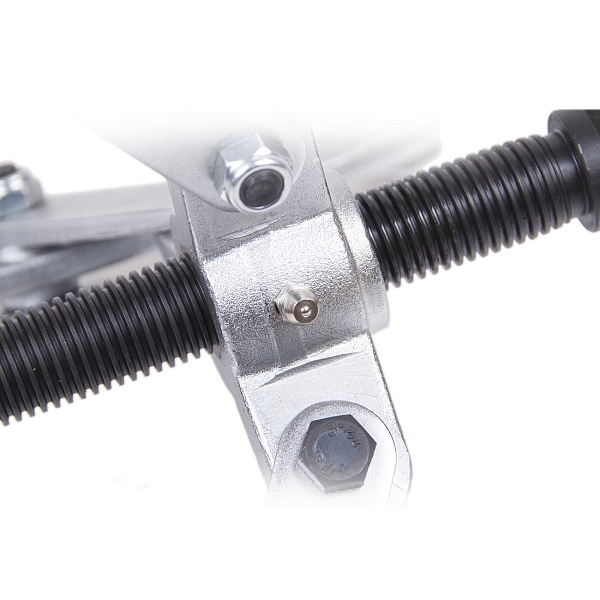 Закаленный винт увеличенного диаметра позволяет прикладывать большее усилие. Две насадки на винт обеспечивают удобство работы на разных опорных поверхностях: коническая - там, где на валу есть центрирующее отверстие; плоская - там, где его нет.