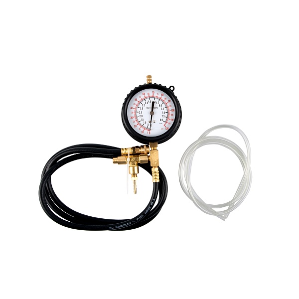 Манометр с гибким шлангом высокого давления оснащен быстросъемным соединением, клапаном сброса и шлангом отвода топлива, что существенно ускоряет работу.