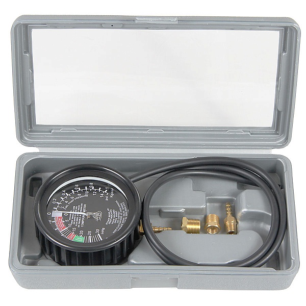 Вакуумметр, тестер топливных насосов Licota ATP-2097 - профессиональный комплект из 5 предметов в пластиковом кейсе. Позволяет диагностировать утечки в вакуумной и топливной системе, производить тестирование вакуумного и топливного насосов, определять неполадки в различных механизмах.