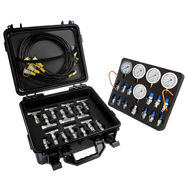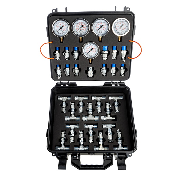 Комплектация: в набор входят 5 манометров разного диапазона измерений, переходники и штуцера для подключения к различным типам гидросистем.