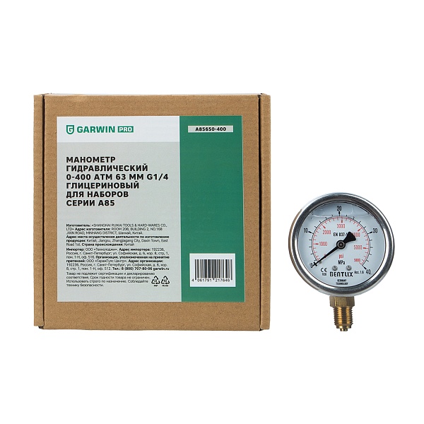Манометр гидравлический 0-400 атм 63 мм G1/4 глицериновый для наборов серии A85, GARWIN PRO, A85650-400