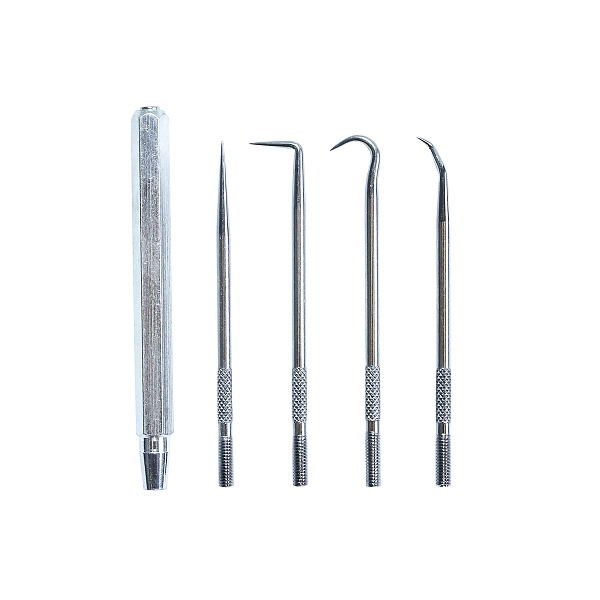 Комплект из 4-х крючков разной конфигурации со съемной рукояткой используется для работ с различными типами сальников.