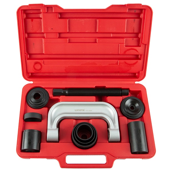 Набор для монтажа и демонтажа шаровых шарниров Licota ATC-2025 универсальный. Комплект из 9 предметов в пластиковом кейсе. Подходит для шаровых большинства легковых автомобилей, легкого коммерческого транспорта и полноприводных автомобилей.