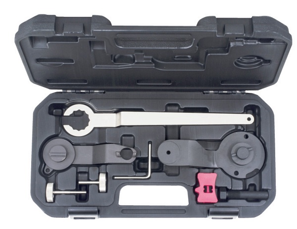 Комплект из 8 предметов в пластиковом кейсе используется для установки фаз ГРМ на автомобилях VAG-группы с двигателями с бензиновым впрыском объемом 1.0 / 1.2 / 1.4 литра.